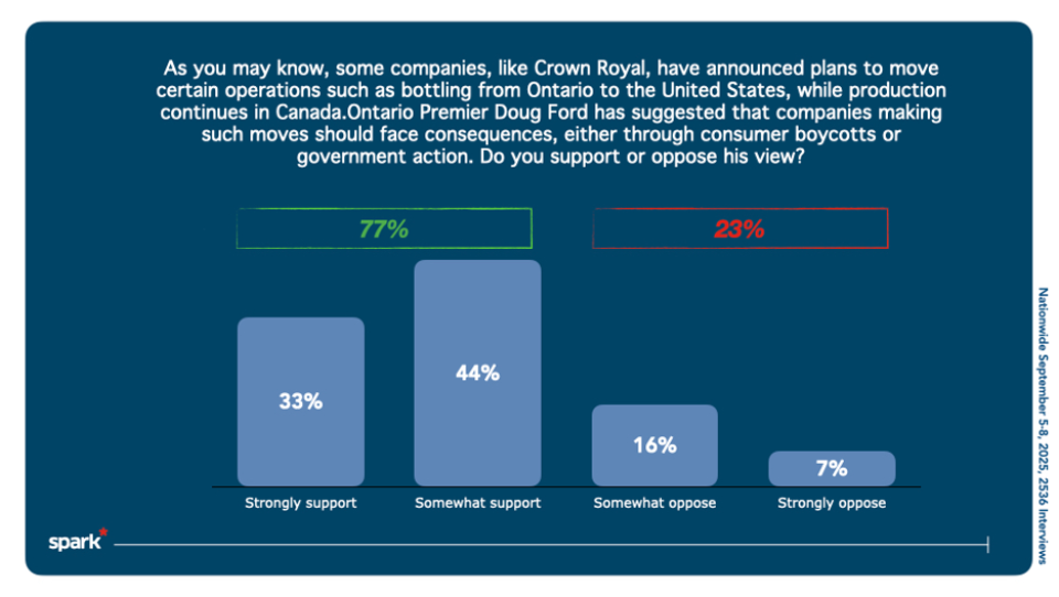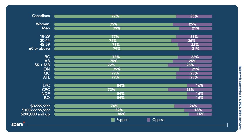 Our latest spark*insights national survey (September 5–8, 2025, 2,536 Canadians) shows 77% support Premier Ford’s position.
