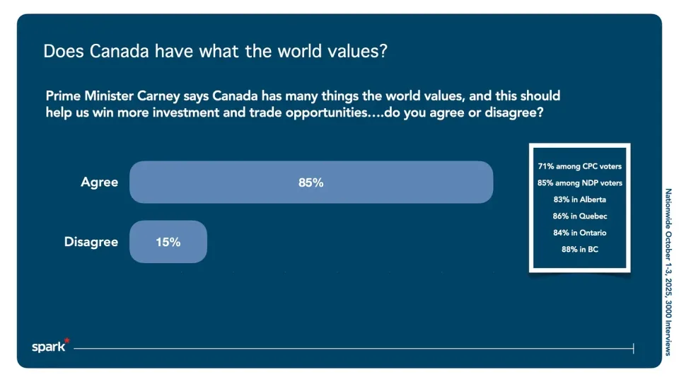 First off, his argument that Canada has many things the world values, and this should help us win more investment and trade opportunities - 85% agree with that. This is a strong endorsement of Canada’s potential, and one which is not affected by partisanship, or even regional sensitivity. It’s an assertion that there is a path to a more settled and successful future for the country’s economy.