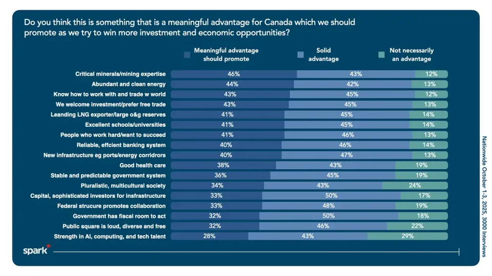 In the course of his speech, Carney itemized the things he believes are powerful advantages for Canada, and considerations that could contribute to Canadian success in global markets. We tested 17 of the items he mentioned. In every case, large majorities believe these are solid or meaningful advantages for Canada.