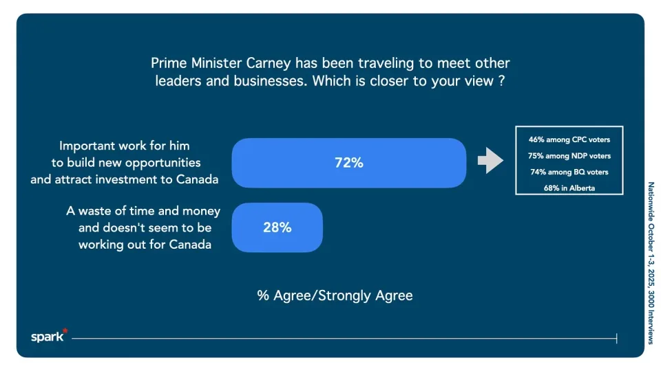 Across the country, 72% think these trips are important work for the PM to do, to build new opportunities and attract investment”. Half of Conservative voters see it that way. Two thirds of Albertans do as well.