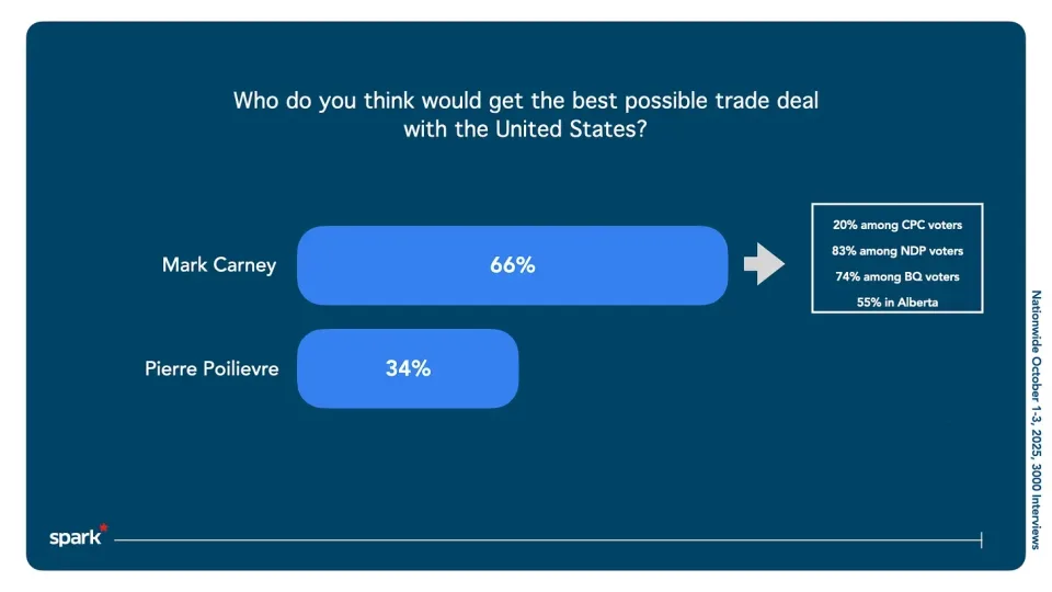 Asked who would get the best possible trade deal with the US, two out of three (66%) say Carney would outdo Poilievre. Even one in five people who voted for Poilievre’s party earlier this year think Carney would do a better job on Canada US trade. In Alberta, 55% see Carney as the better choice for this task.