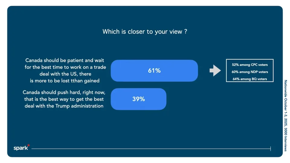 One of the most discussed aspects of the current trade and tariffs situation is about the pace towards a resolution. What we see is not a simple ‘elbows up’ or ‘elbows down’ preference, it’s more like ‘head down, and take the time needed to get the best possible outcome’. By a 61%-39% margin Canadians think it’s better to be “patient and wait for the best time to work on a trade deal with the US, there is more to be lost than gained”.