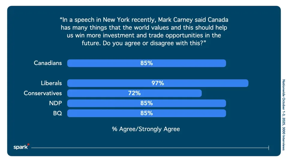 Finally, while Canadians obviously want the best outcome possible with the US, the Prime Minister’s bullishness about Canada’s opportunities with the rest of the world is shared pretty widely. 85% agree with the PM’s assertion in New York recently that “Canada has many things that the world values, and this should help us win more investment and trade opportunities in the future.”