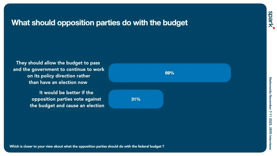 A majority in our post budget poll (69%) say they want opposition parties to allow the budget to pass and the government to continue in the policy direction it has set. That leaves only 31% thinking it’s time to go back to the polls - 202 days after the last time we did that.