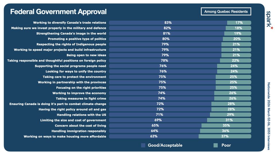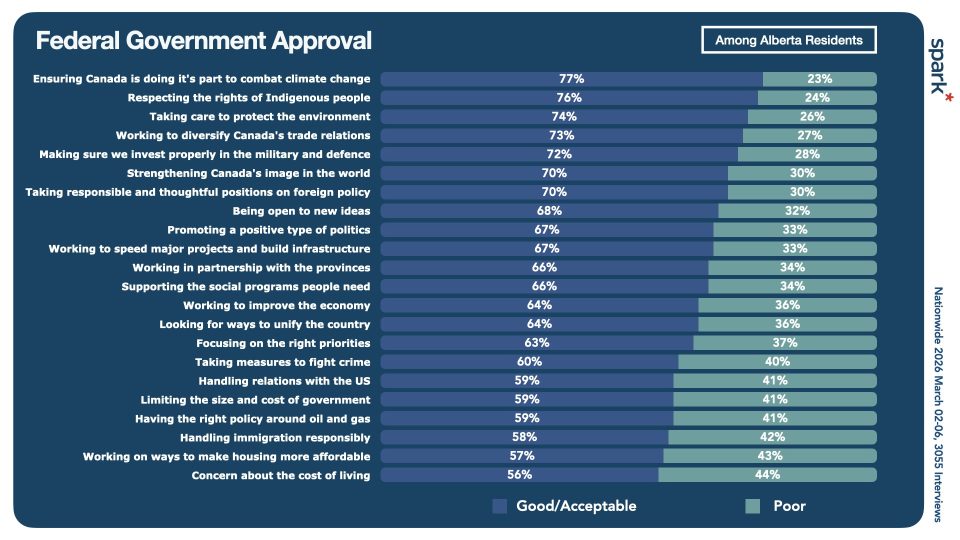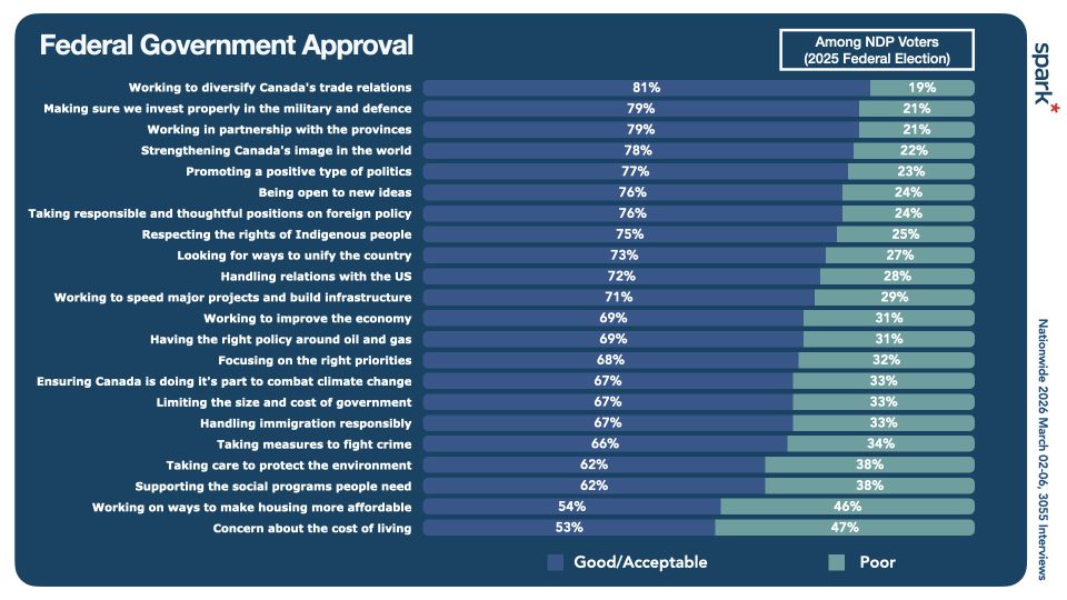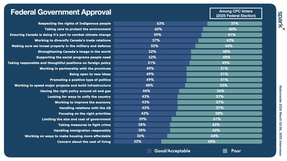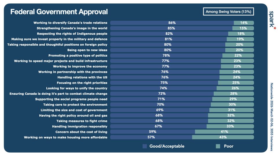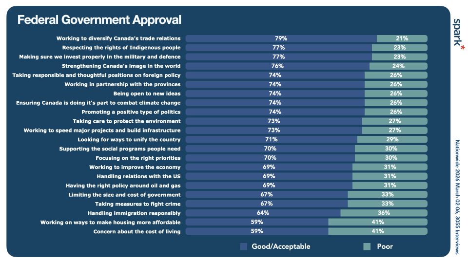 In our latest polling at Spark Advocacy, we asked respondents to rate the Carney government’s performance on 22 different items. Answer options were “good” “acceptable” or “poor”.