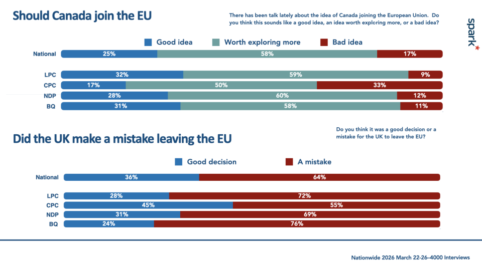 Outright opposition to the idea peaked at 23% in Alberta and 30% among Conservative Party voters. In other words, majorities in every region, across all party lines, and every generation felt it was at least an idea worth considering.